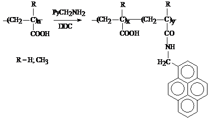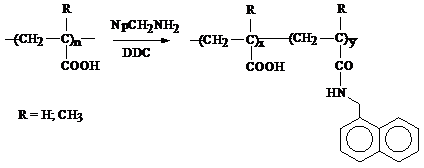The hydrophobically (fluorescently and with an alkyl-chain label) modified polymers were synthesized following recipes published elsewhere [D.F. Anghel, V. Alderson, F.M. Winnik, M. Misuzaki, Y. Morishima, Fluorescent dyes as model ‘hydrophobic modifiers’ of polyelectrolytes: a study of poly(acrylic acid)s labelled with pyrenyl and naphtyl groups, Polymer, 39 (1998) 3035-3044; B. Magny, Polyelectrolytes Associatifs: Methodes de Synthese, Comportement en Milieu Dilue et Semi-Dilue, These de Doctorat, 1992.]. The chemical reactions involved were: