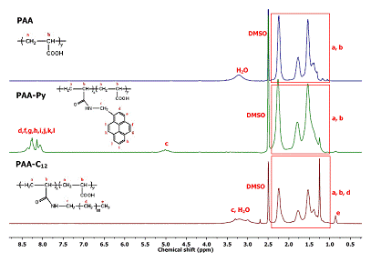 The content of pyrene grafted on polymeric acids was determined by UV-Vis and 1H-NMR. 1H-NMR spectroscopy offers quantitative information regarding the modification degree of PAA. In the case of PAA-Py sample, we determined the modification degree based on the integral corresponding to pyrene aromatic protons (8-8.5 ppm) and the integral corresponding to PAA backbone protons (1-2.4 ppm). To calculate the modification degree for PAA-C12 we used the signal corresponding to CH3 (0.86 ppm) protons from the alkyl chain of the amide, the signal between 1-2.4 ppm corresponding to PAA backbone protons, and the methylene protons (d protons see Figure 2012-2) from the dodecyl chain.