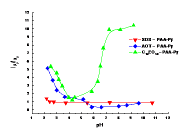 A qualitative measure of energy transfer for studied systems is the IPy/INp ratio. A high value of it reflects high efficiency of non-radiative energy transfer and reverse. For anionic SDS and AOT surfactants, IPy/INp decreases with pH (Figure 2013-2). Increasing the pH causes the transformation of carboxyl groups into carboxylate groups, and PAA acquires more negative charges and adopts a more open conformation. This conformation has many negative charges that repel anionic micelles and NRET decreases. For the C14EO10 – PAA-Py system, it was initially observed a gradual decrease in IPy/INp values, until pH = 4.24 when a minimum is reached, then IPy/INp values increased and has a plateau above pH 7. The increase of NRET can be explained taking into consideration the non-cooperative and cooperative binding of the surfactant molecules onto the polymer. They produce polymer uncoiling, and drives out the pyrene labels in water. If Py encounters a surfactant micelle containing excited Np, the IPy/INp will increase. The number of Py labels available for energy transfer becomes constant and explains the plateau above pH 7.