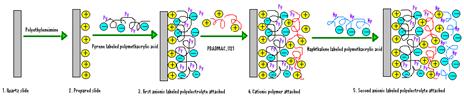 The LbL deposition is a thin film fabrication technique. The films are formed by depositing alternating layers of oppositely charged materials with wash steps in-between. In our case, the film is deposited on quartz surface by dipping succesively the slide into beakers containing polycation and containing polyanion solutions (Figure 2014-1).