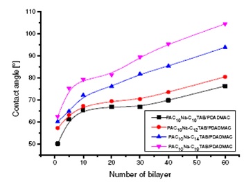 One observed that the contact angle increases with the number of bilayers and with surfactant hydrophobicity (see Figure below). The films containing PAC10Na-C18TAB are more hydrophobic than those with PAC10Na-C10TAB.